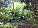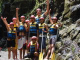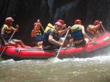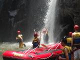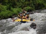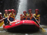 バカスレヴィ社が催行するラフティングはクルンクンエリアにあるメランギット川。アユン川がラフティングの川として1日に多くのボートが通るのに比べるとメランギット川でのラフティングはバカスレヴィ社催行のみとなっています。メランギット川には1-4mの行程差があるところや急カーブ、速い水の流れや滝つぼに落ちていく強烈な水しぶきなど、スリル満点のスピード感を楽しむことができます。